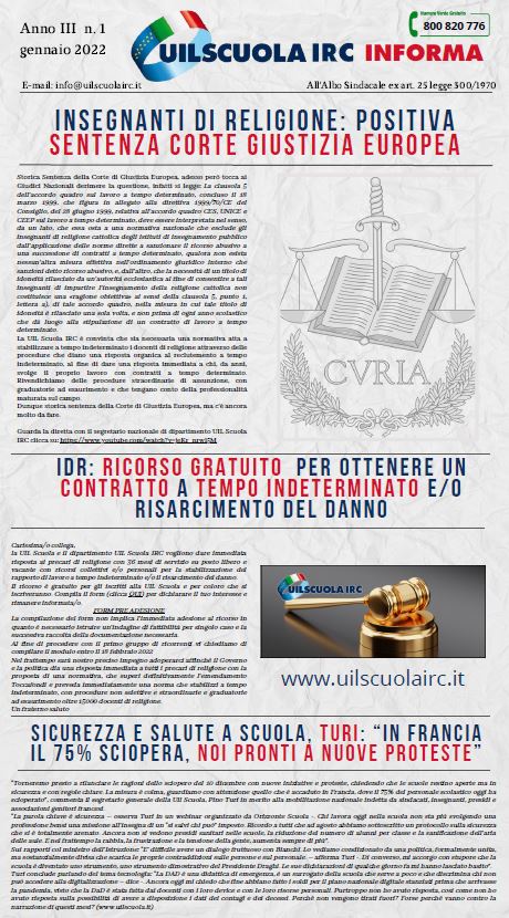 Nota sindacato UIL scuola Stampa Email Dettagli Categoria: Non categorizzato Pubblicato: 17 Gennaio 2022 Visite: 1147 Docenti Bacheca Sindacale Allegati: FileAutoreDimensione del File N._1-2022_-_DOCENTI_DI_RELIGIONE_-_UIL_SCUOLA_IRC_INFORMA.pdfLauraT2951 kB nota_sindacale_UIL_IRC.pdfLauraT2951 kB