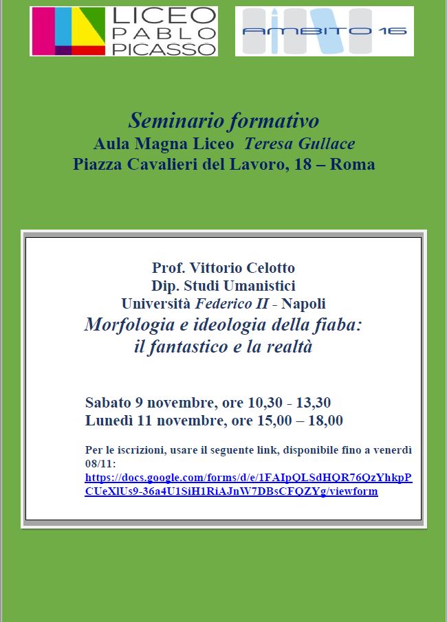 Seminario formativo "Morfologia e ideologia della fiaba: il fantastico e la realtà" Stampa Email Dettagli Categoria: Ambito 16 Pubblicato: 05 Novembre 2019 Visite: 296 Docenti