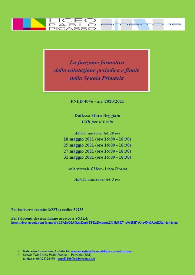 Formazione Ambito 16 maggio 2021 Stampa Email Dettagli Categoria: Ambito 16 Pubblicato: 12 Maggio 2021 Visite: 149 Docenti Allegati: FileAutoreDimensione del File La valutazione finale nella Primaria - Dott.ssa Beggiato.pdfLauraT101 kB