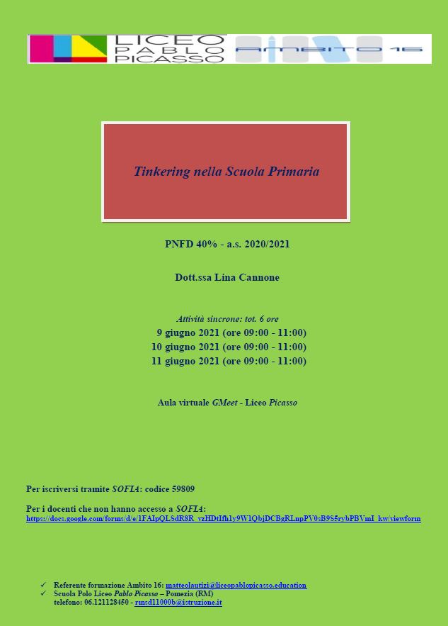 Formazione Ambito 16 giugno 2021 Stampa Email Dettagli Categoria: Ambito 16 Pubblicato: 01 Giugno 2021 Visite: 154 Docenti Allegati: FileAutoreDimensione del File Tinkering nella Scuola Primaria - Dott.ssa Cannone.pdfLauraT102 kB