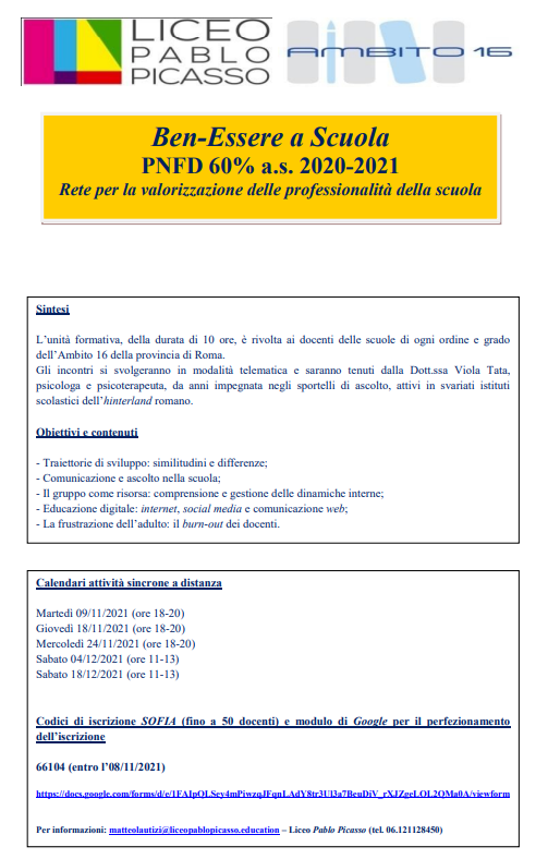 Corso di formazione Ambito 16 - Ben-Essere a Scuola Stampa Email Dettagli Categoria: Ambito 16 Pubblicato: 05 Novembre 2021 Visite: 124 Docenti Allegati: FileAutoreDimensione del File Locandina Ben-Essere a Scuola.pdfLauraT425 kB