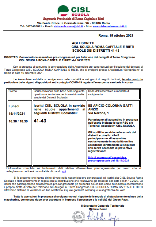 Convocazione assemblea iscritti CISL 15/11/2021 distretti 41-43 Stampa Email Dettagli Categoria: Circolari e comunicazioni Pubblicato: 02 Novembre 2021 Visite: 177 Docenti ATA Bacheca Sindacale Allegati: FileAutoreDimensione del File Convocazione_assemblea_dist_41-43_del_15_11_2021 (1).pdfLauraT275 kB