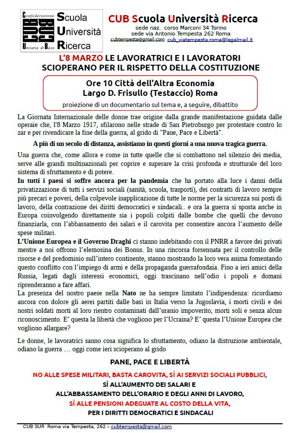 CUB Scuola Università Ricerca - Sciopero 08-03-2022 Stampa Email Dettagli Categoria: Circolari e comunicazioni Pubblicato: 07 Marzo 2022 Visite: 65 Docenti ATA Bacheca Sindacale Allegati: FileAutoreDimensione del File CUB_SCUOLA_SCIOPERO 8 MARZO_2022.pdfLauraT143 kB