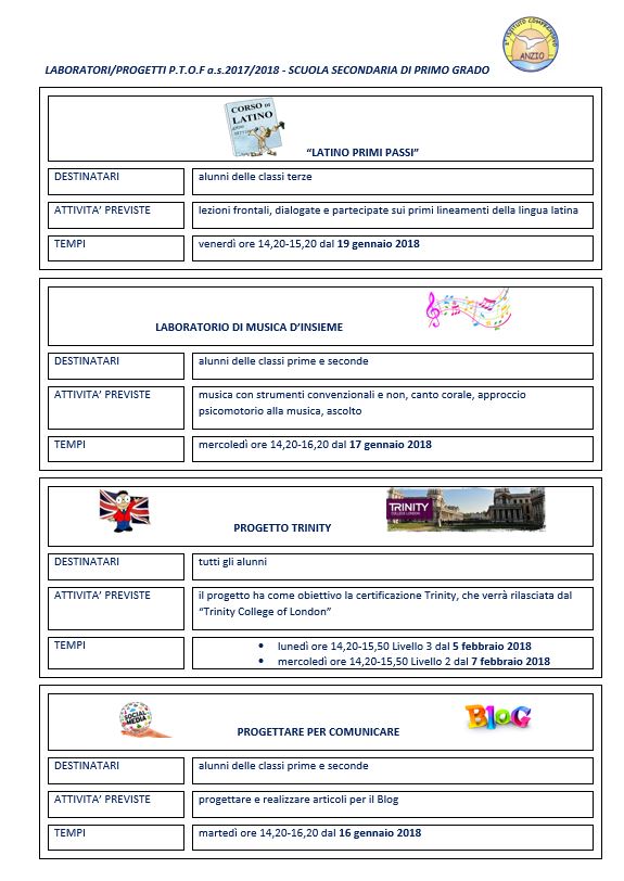 Laboratori Scuola Secondaria di Primo Grado Stampa Email Dettagli Categoria: News ed eventi Pubblicato: 08 Gennaio 2018 Visite: 698 Genitori Alunni ATA