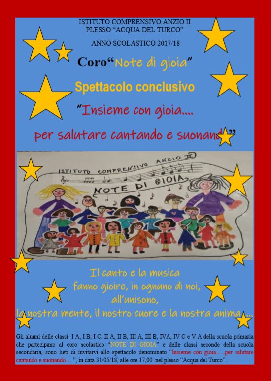 Rappresentazione finale Coro "Note di gioia" Stampa Email Dettagli Categoria: News ed eventi Pubblicato: 28 Maggio 2018 Visite: 1068 Docenti Genitori Alunni ATA