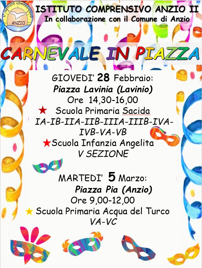 Locandina "Carnevale in piazza" Stampa Email Dettagli Categoria: News ed eventi Pubblicato: 23 Febbraio 2019 Visite: 586 Docenti Genitori Alunni Allegati: FileAutoreDimensione del File Carnevale2019.pdfLauraT356 kB