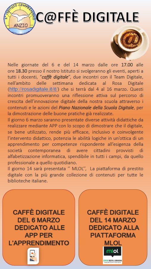 Caffè digitale 6 e 14 marzo 2019 Stampa Email Dettagli Categoria: News ed eventi Pubblicato: 26 Febbraio 2019 Visite: 458 Docenti