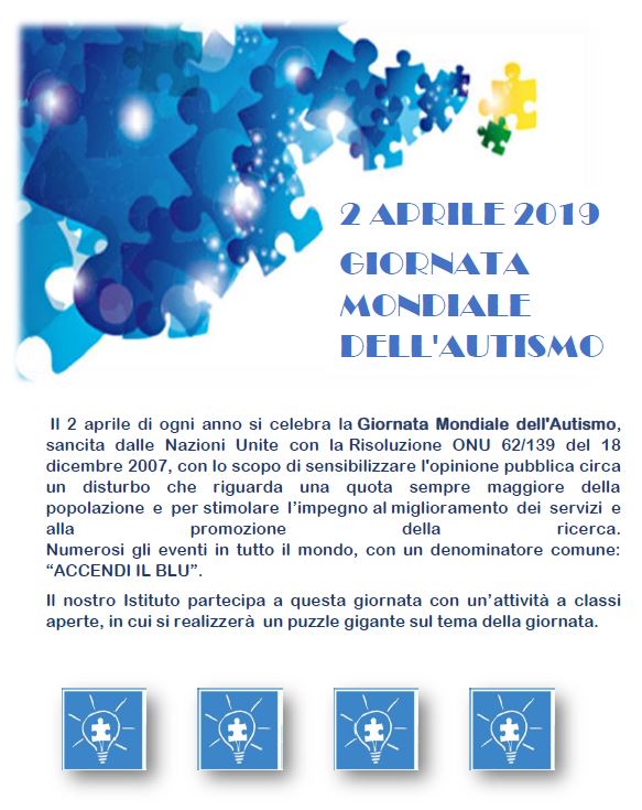 Giornata mondiale dell'autismo Stampa Email Dettagli Categoria: News ed eventi Pubblicato: 31 Marzo 2019 Visite: 516 Docenti Genitori