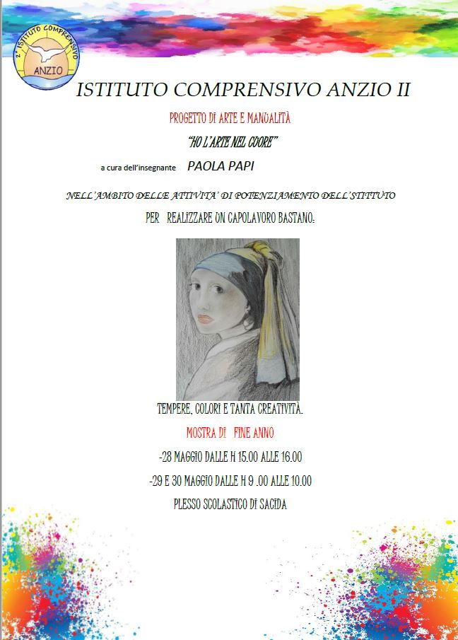 Locandina della mostra finale "Ho l'arte nel cuore" Stampa Email Dettagli Categoria: News ed eventi Pubblicato: 10 Maggio 2019 Visite: 808 Docenti Genitori