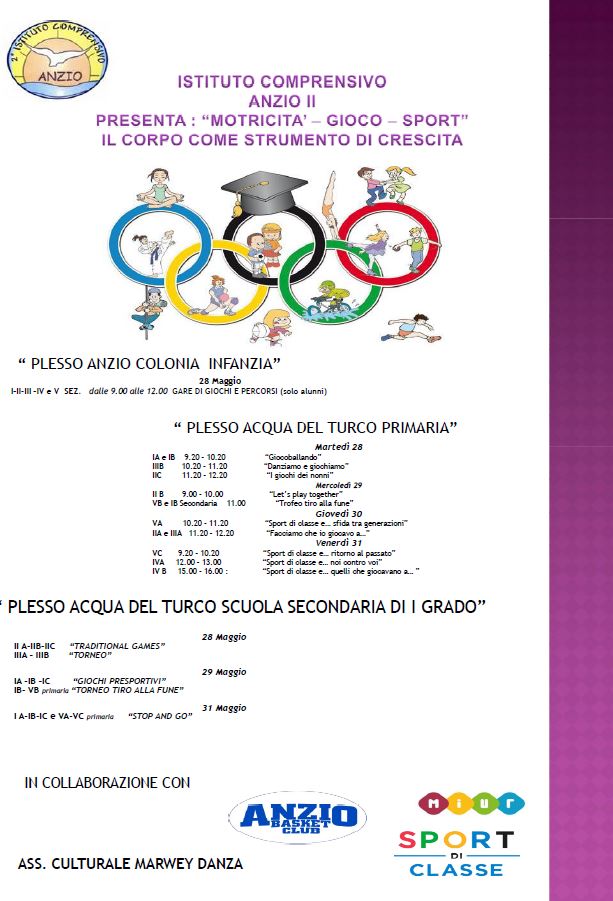 Settimana "Motricità - Gioco - Sport" - Plesso Acqua del Turco Stampa Email Dettagli Categoria: News ed eventi Pubblicato: 22 Maggio 2019 Visite: 2339 Docenti Genitori Alunni