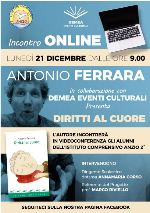 Incontro con Antonio Ferrara 21-12-2020 Stampa Email Dettagli Categoria: News ed eventi Pubblicato: 14 Dicembre 2020 Visite: 286 Docenti Genitori Alunni Lunedì 21 dicembre dalle ore 9:00 Antonio Ferrara presenta "Diritti al cuore" agli alunni dell'Istituto Comprensivo Anzio II.